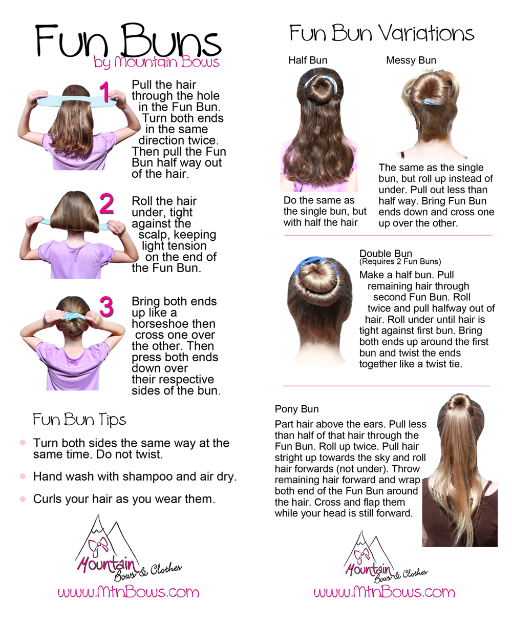 Fun Buns are a fun, quick, and easy way to get your hair up AND it stays in place! No fighting pony tail holders, no need to redo as it gets loose throughout the day. They truly stay put! And, they come in many styles and sizes so that they really work for anyone. The trick with these is to order the right size. Please see our size chart and if you need any help, we are always happy to walk you through it. Keep in mind that some of the choice is personal preference. If you like a larger “bow,” consider ordering a size up. If you would like it smaller, you can order a size down and they will work just as well.